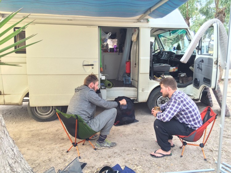 Water has been a bit of a challenge for us. We estimated that we use about 6 to 7 liters a day in water and this includes drinking, teeth brushing and washing dishes. We have been using the water source everywhere for washing dishes but purchasing water for drinking. The water connected to our sink only holds 15 liters. This is not a lot. We go through that in a day and a half. We have saved all the water bottles we have purchased and have been reusing them to store water that we can fill up whenever a water source is available. We have resorted to storing water in various places in the van, mostly under the bed and when the water bottles are empty, we clamp them to the back of Mac. We went into the town of Agadir in Morocco to try and get some bigger water tanks and have them possibly attach it to the bottom of Mac. They told us we had to get custom steel water tanks that would cost $270 per tank – one for drinking water and one for the garbage water. And that was just the price for the tanks and not for a new water pump, piping and installation we needed. We passed. As of now, we are looking at other cost efficient alternatives. Surprisingly enough, the water from the faucet here in Morocco has been fine to drink. Neither of us has gotten sick yet – knock on wood. As much as this whole water thing has been a nuisance, it’s not the most urgent.