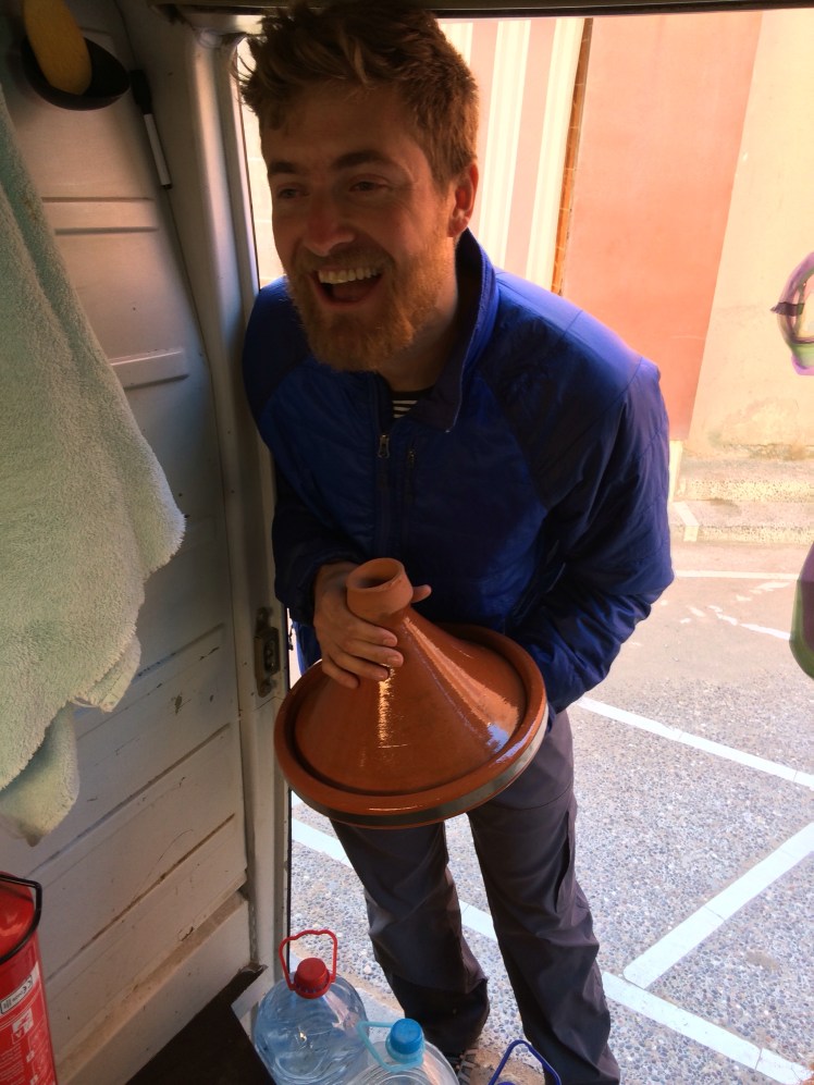 Will and I have been making some amazing home cooked meals. Groceries have been outrageously cheap so we have been spoiling ourselves with pretty lavish feasts. For example one night we had steak with oyster mushrooms in a garlic and shallots wine sauce with beets and goat cheese salad paired with a bottle of Reserve wine from the vineyard we stayed at – Domain de Cadables. We saw kangaroo meat being sold at the market and Will really wanted it but I just couldn’t do it. We both realized that we have been eating better traveling and living in a van than we do at home. I personally thought I was going to lose weight on this trip but I have definitely gained weight from all the good food out here. In Cordoba and Baena, both cities in Spain, we tried to buy ground beef for spaghetti and cheeseburgers, and realized when we ate it that they only sold ground beef mixed with pork. It was very interesting to bite into a beef/pork burger. In Morocco we purchased a tajine and have been making tajine almost every night.