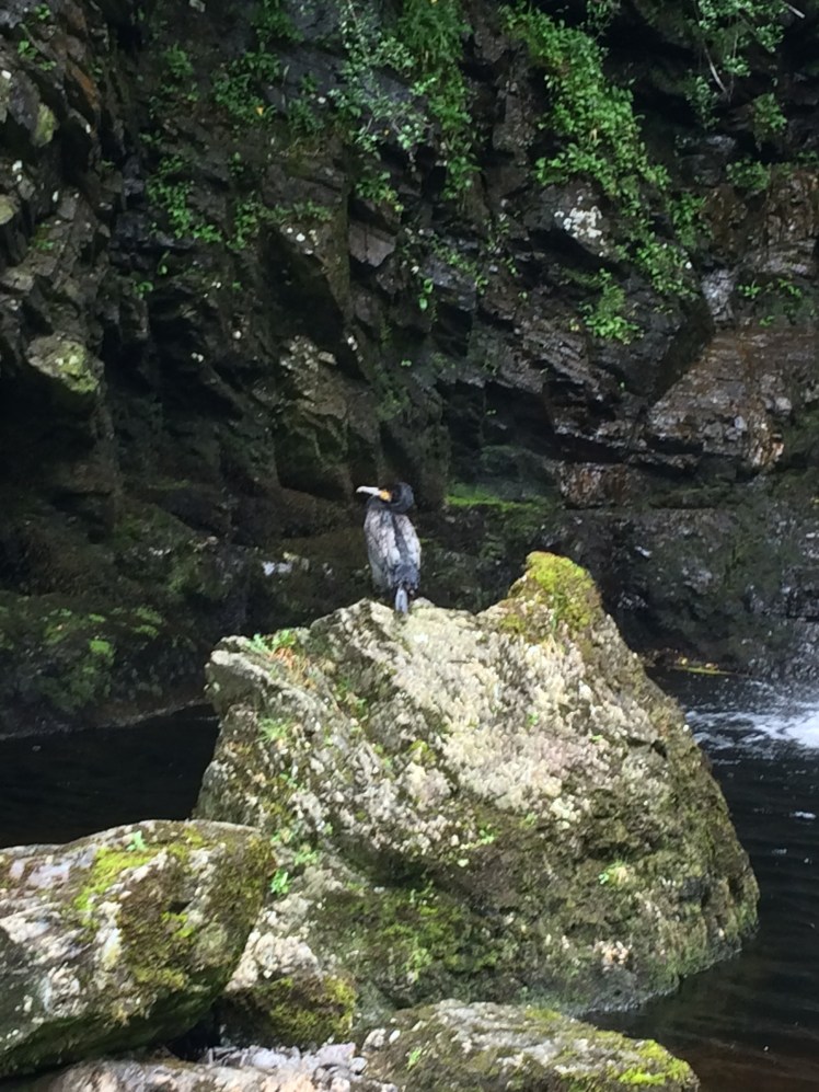 Bird by the waterfall in Galloway Forest Park (Cormorant maybe?)